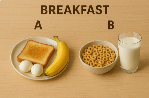 - 아침: 삶은 달걀 + 토스트 + 바나나 or 시리얼 + 우유